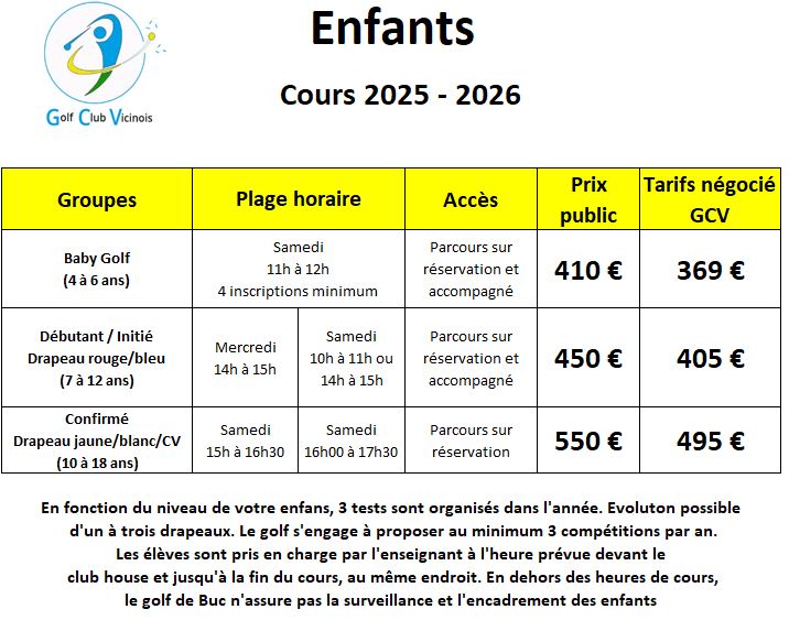 Pour les inscriptions à l’école de Golf de BUC ,les jeunes inscrits dans votre association bénéficient de 20 % de réduction sur le tarif normal :