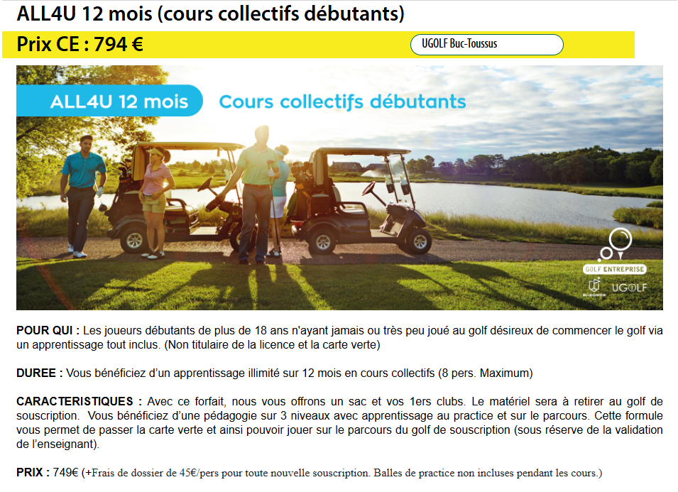 Ce tarif est accessible par la boutique UGolf Entreprises2/ Ecole de golf